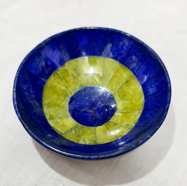 Presenting here stunning Lapis Lazuli with Jade Gemstone Bowl has an attractive blue and Lemon color with inclusions of golden pyrite. It is a very striking piece and the ideal place to keep your gemstones or trinkets safe.