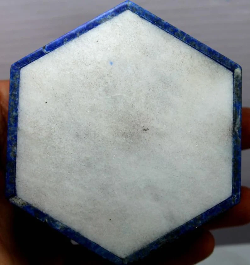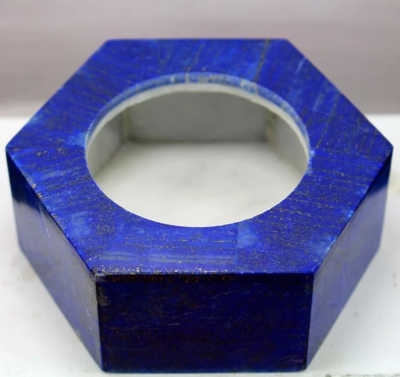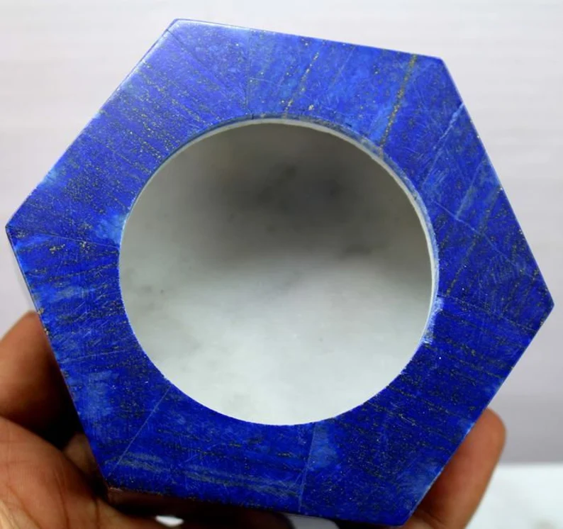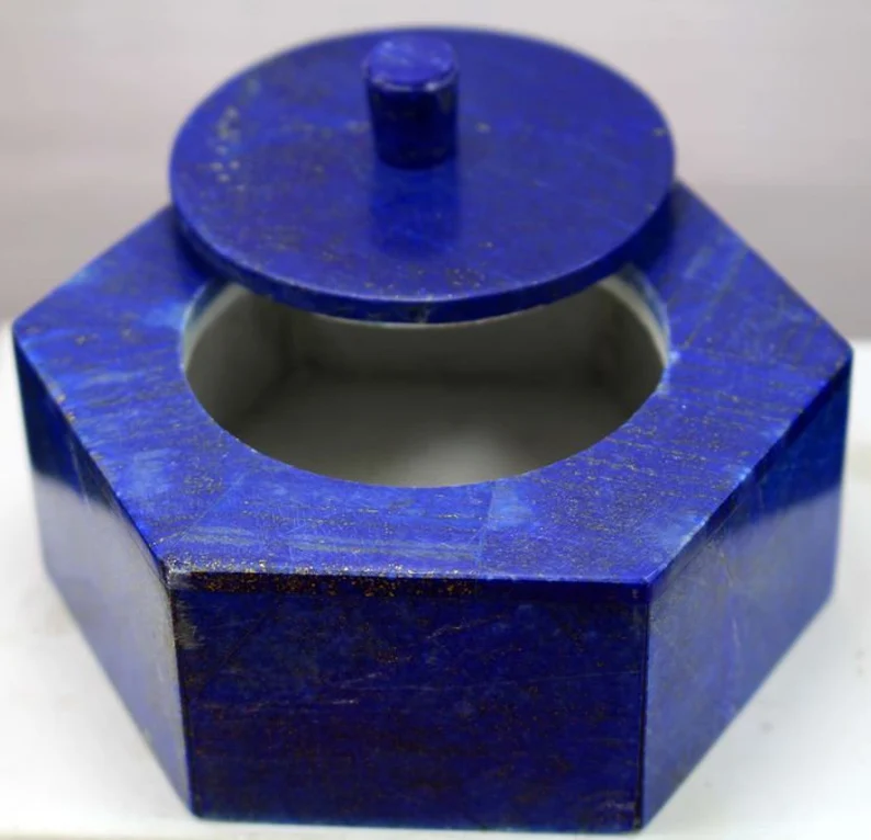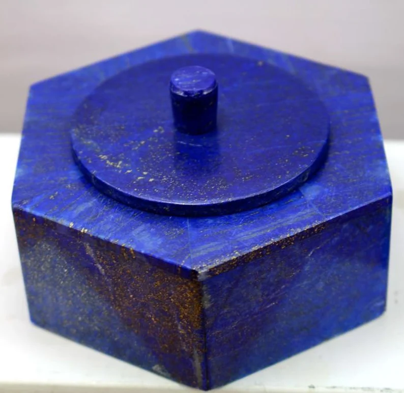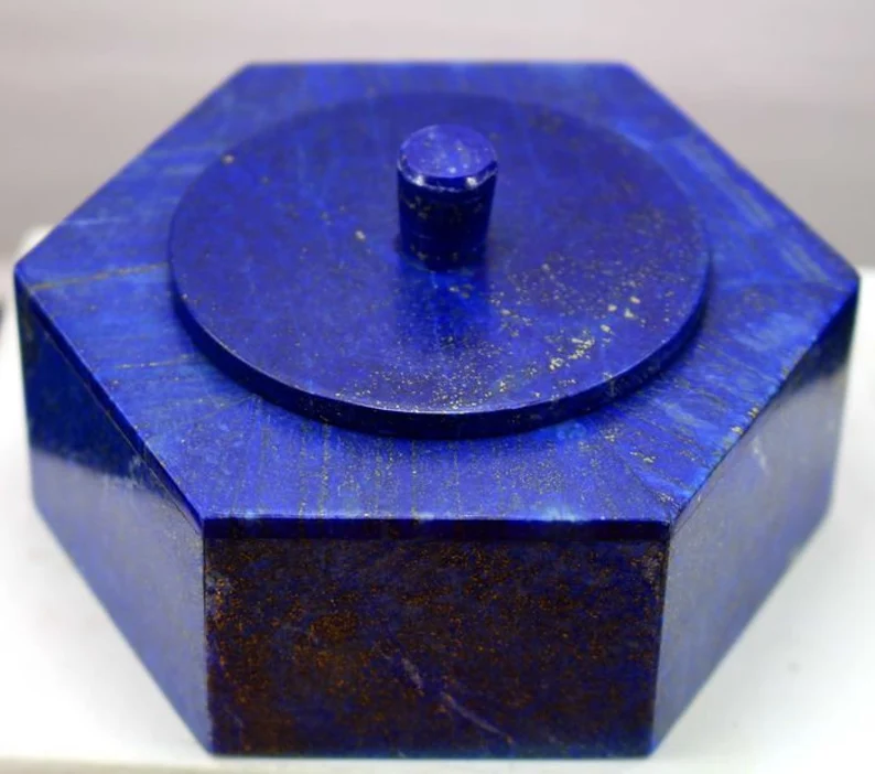 Elegant handcrafted jewelry box made from natural royal blue Lapis Lazuli combined with fine marble accents. Weighing 325 grams and measuring 84 × 62 mm, this compact piece features a polished finish that highlights the rich blue tones and natural stone contrast.