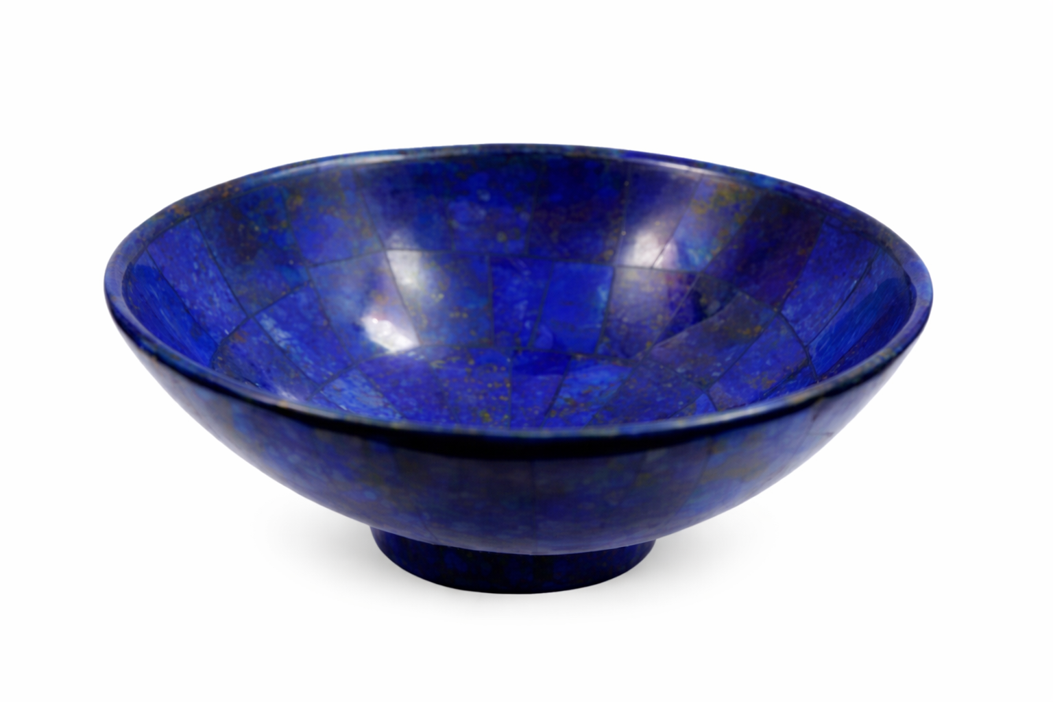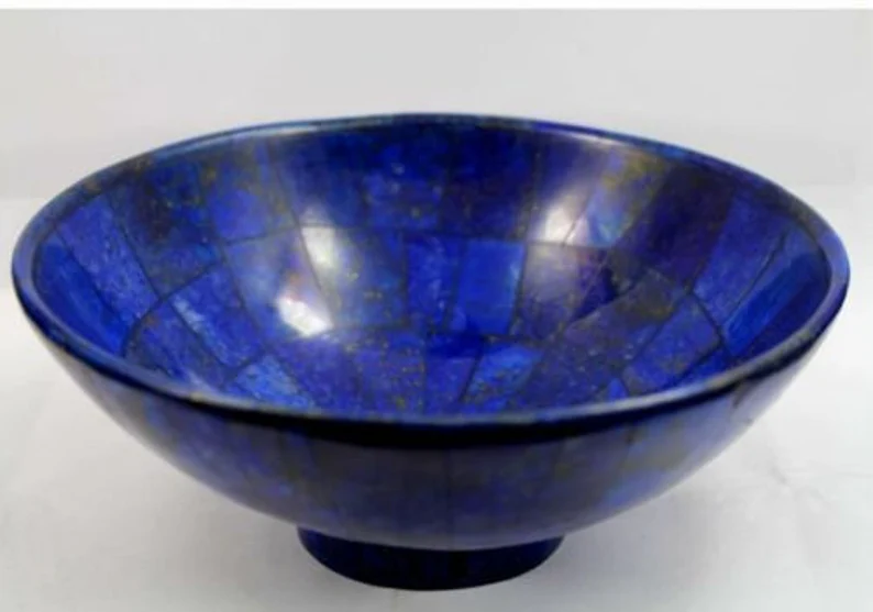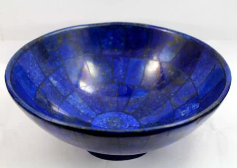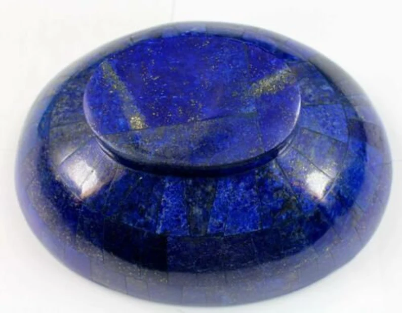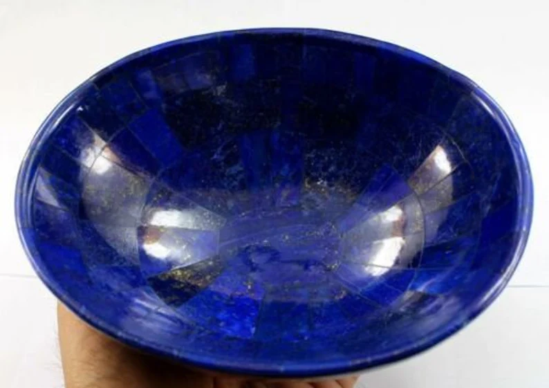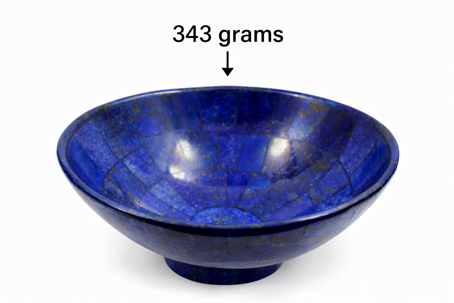 Beautiful handmade Lapis Lazuli bowl sourced from Badakhshan, Afghanistan, known for producing some of the finest deep-blue lapis in the world. Weighing 343 grams and measuring approximately 5 inches wide, this polished bowl showcases natural golden pyrite flecks within rich royal blue stone.