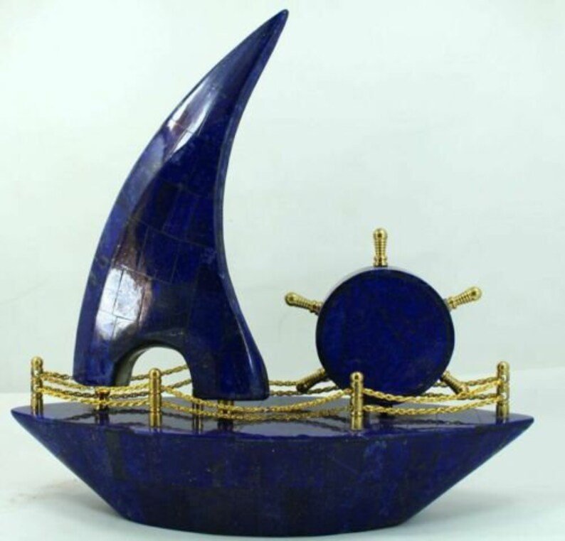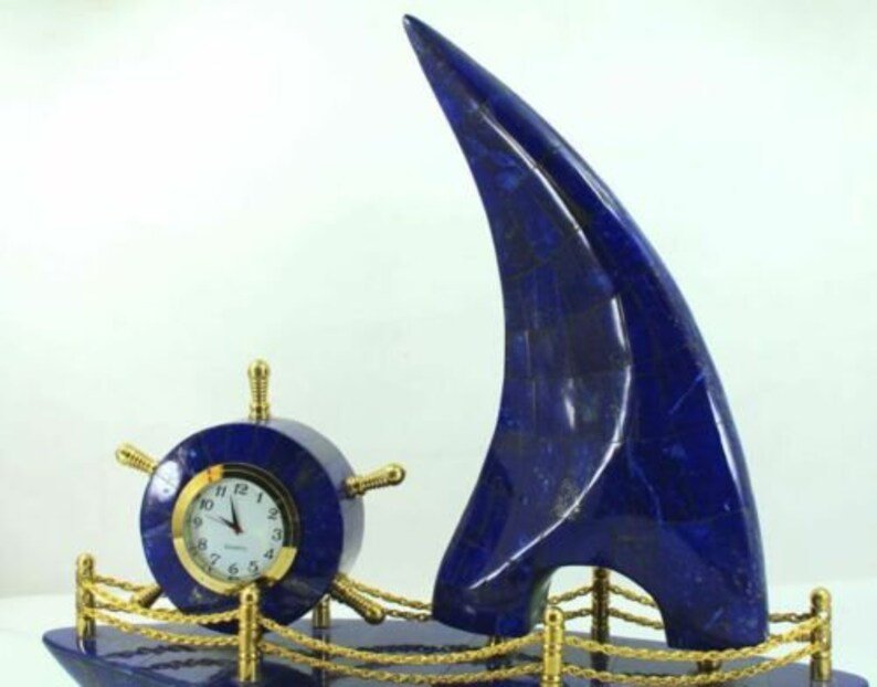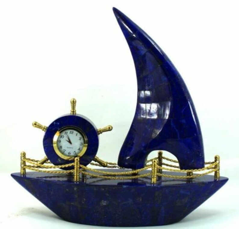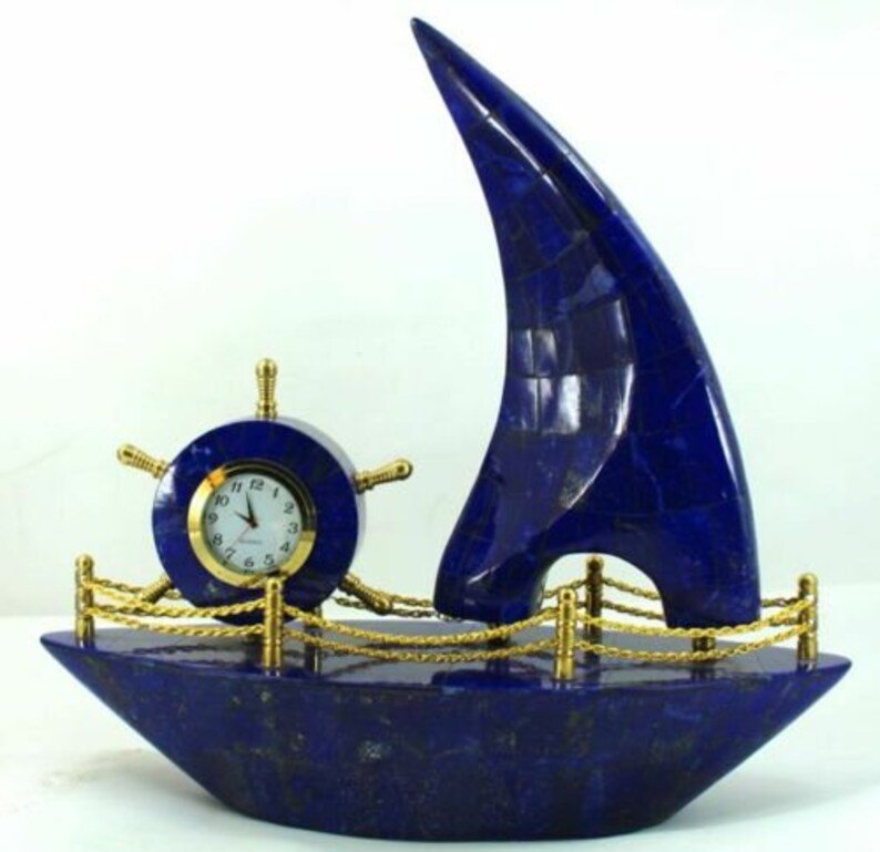 New design and very beautiful Lapis Lazuli Boat With Clock Decorative from Afghanistan. It’s a very Unique Boat and It will enhance more beauty to your mineral collection and your home/office.