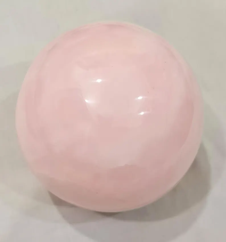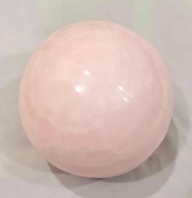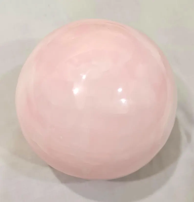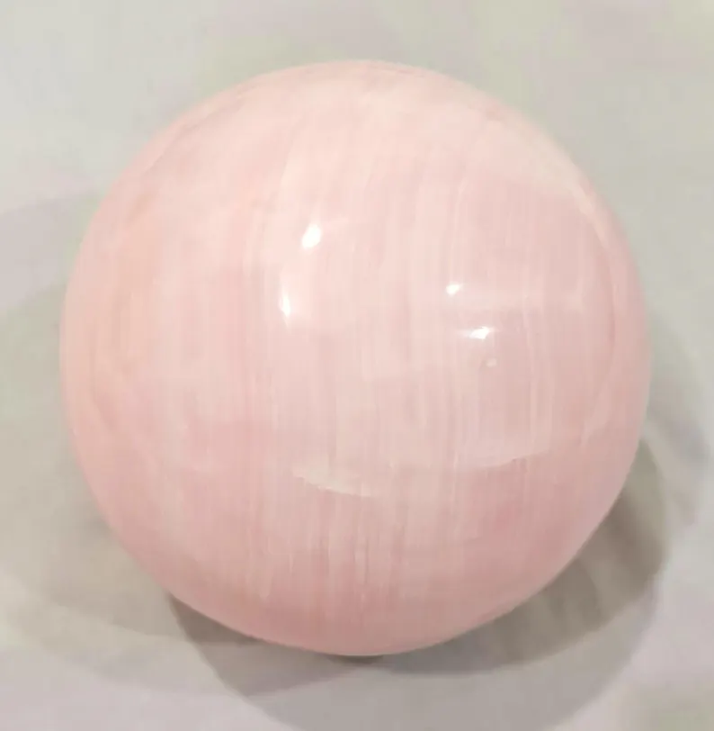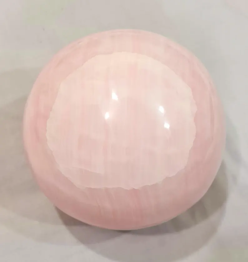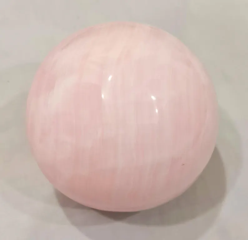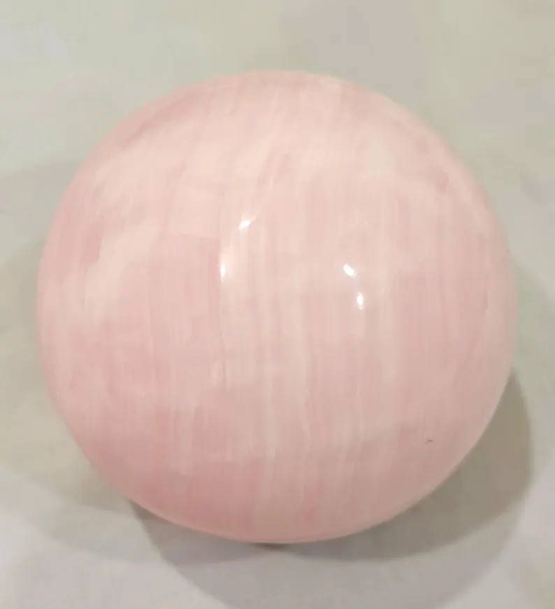 Elegant handcrafted sphere made from natural pink Mangano Calcite, featuring soft blush tones and a smooth polished finish. Weighing 4.160 kg and measuring 140 mm in diameter, this beautiful piece is ideal for home décor, crystal collections, or display.