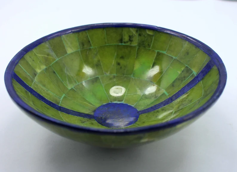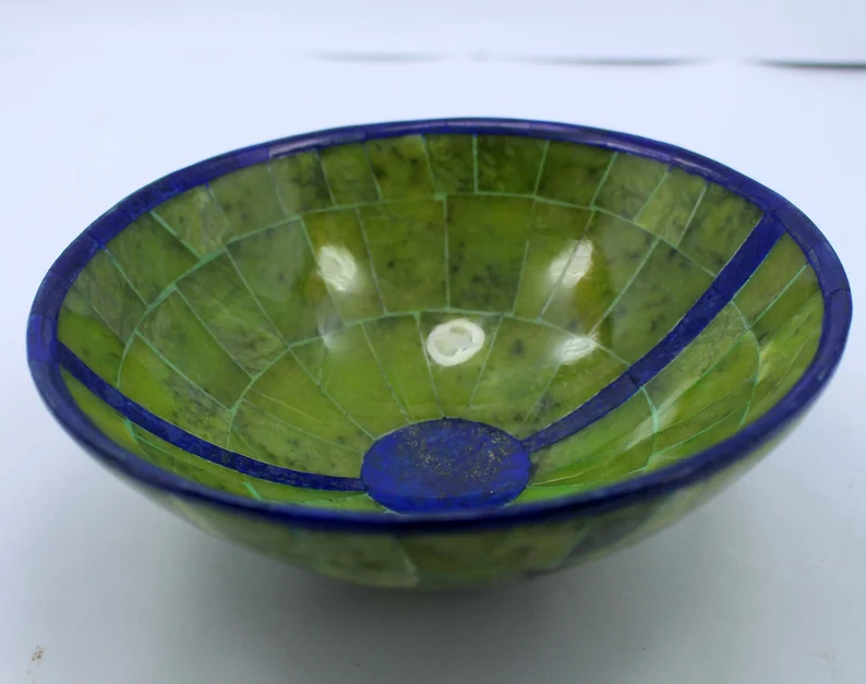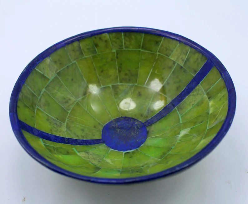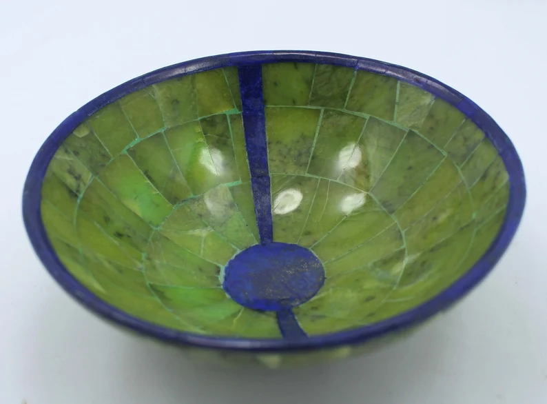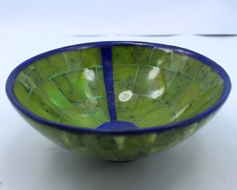 Elegant handcrafted bowl made from natural royal blue Lapis Lazuli combined with Jade, sourced from Afghanistan. Weighing 445 grams and measuring 150 × 150 × 70 mm, this polished piece showcases deep blue tones contrasted with natural green stone accents.