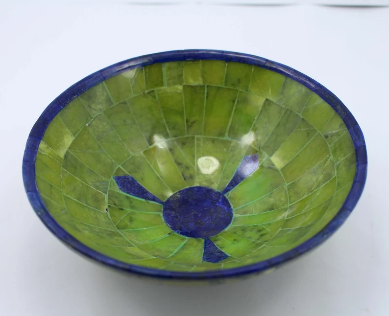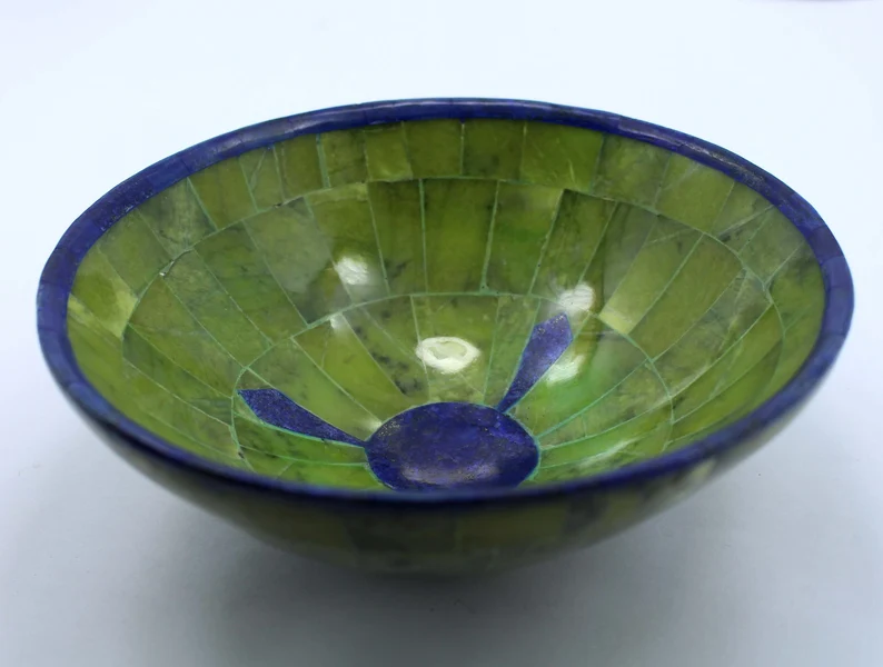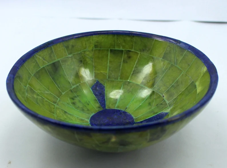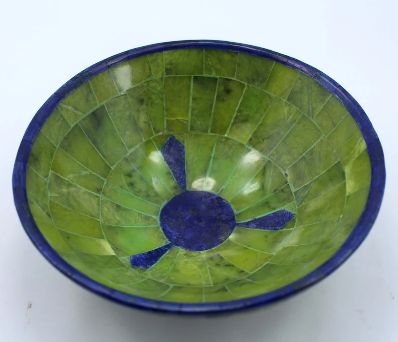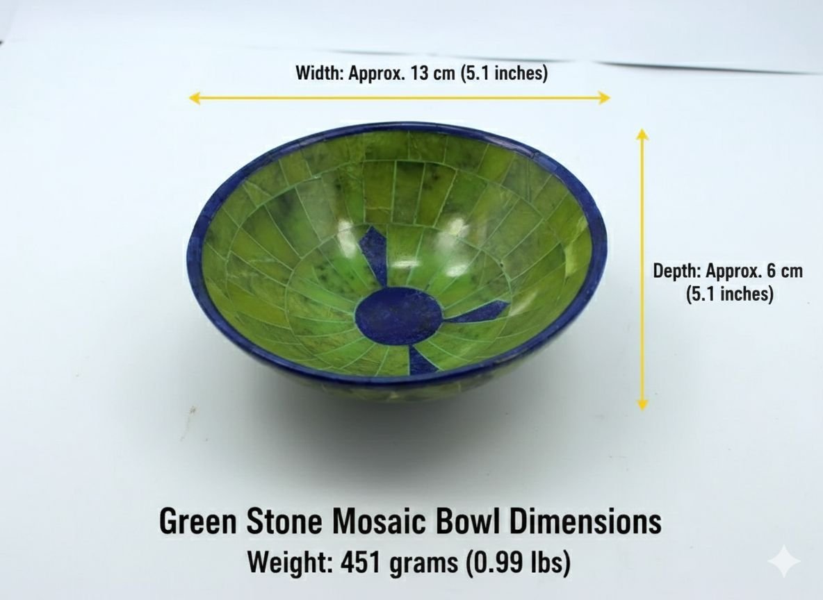 Elegant handcrafted bowl made from natural royal blue Lapis Lazuli combined with Jade accents, sourced from Afghanistan. Weighing 451 grams and measuring 150 × 150 × 70 mm, this polished piece features rich blue tones with natural mineral contrast, making it a unique decorative item.