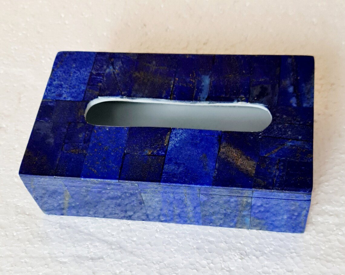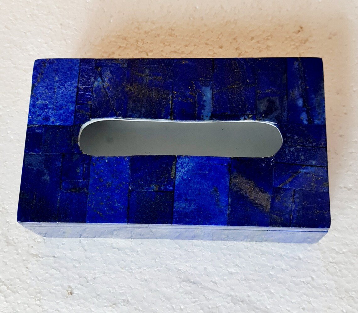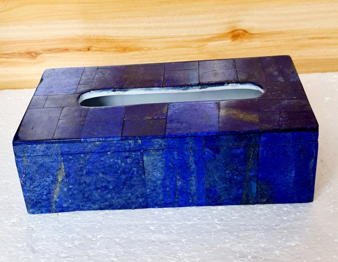 This image shows a rectangular stone tissue box cover crafted from deep blue lapis lazuli or a similar semi-precious stone. The surface features rich shades of royal blue with natural variations, subtle gold-toned flecks, and visible stone veining that give it a distinctive, handcrafted look. The top has a smooth, elongated oval opening for dispensing tissues, neatly cut and polished. Its clean, solid lines and glossy finish give it a luxurious, elegant appearance, making it both a functional household item and a decorative accent suitable for a bathroom, office, or living space.1316 gram Handmade Royal Blue Lapis Lazuli Tissue Box, Home Decor from Afghanistan -210x120x60 mm
