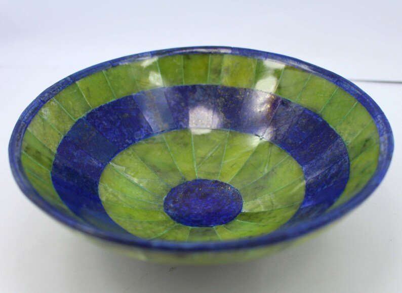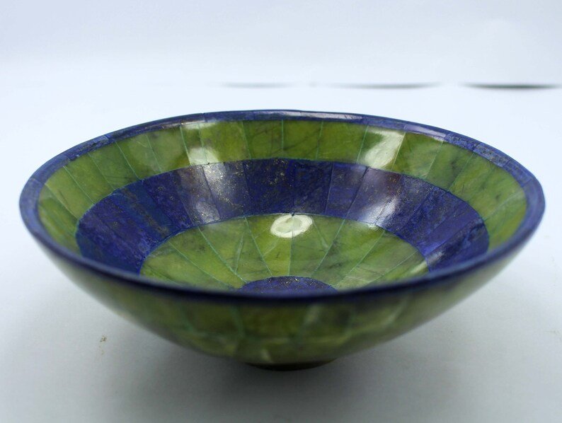 Presenting here stunning Lapis Lazuli with Jade Gemstone Bowl has an attractive blue and Lemon color with inclusions of golden pyrite. It is a very striking piece and the ideal place to keep your gemstones or trinkets safe.